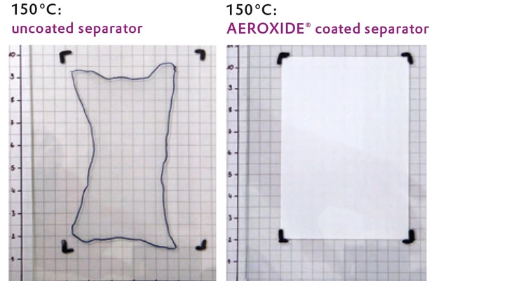 陶瓷涂层可抑制隔膜的热收缩,提升电池安全性(左图为无涂层隔膜,右图为覆有赢创AEROXIDE®涂层的隔膜)。