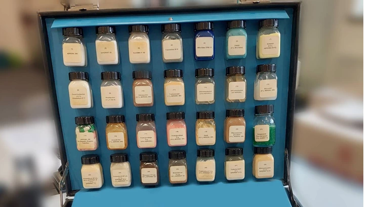 1960年代:销售部人员用装满小瓶样品的箱子向客户介绍不同类型的AEROSIL®。