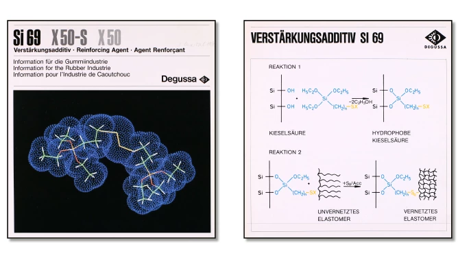 强力偶联:德固赛(赢创前身)于1972年/73年推出硅烷偶联剂Si 69®。硅烷可实现亲水性二氧化硅与橡胶聚合物的化学偶联。二氧化硅/硅烷体系诞生。